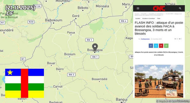 В результате перестрелки поздним вечером в пятницу в западной части Центральноафриканской Республики убиты 3 военнослужащих, ещё 1 был ранен. Неизвестные вооруженные лица атаковали контрольно-пропускной пункт на дороге в районе Босангоа префектуры Уам. Бандиты застали солдат врасплох интенсивным огнем и временно захватили блокпост, после чего скрылись.