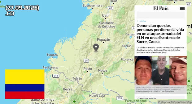 По меньшей мере 2 человека погибли и 2 получили ранения в субботу в результате атаки Армии национального освобождения (ELN) на ночной клуб в Сукре, департамент Каука, на западе Колумбии. Вооружённые бандиты подъехали к заведению на двух автомобилях, после чего вошли внутрь и открыли огонь по людям, которые весело проводили время под музыку и с алкоголем.