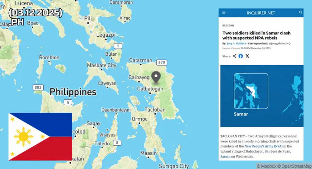 В перестрелке с остатками Новой народной армии (NPA) в муниципалитете Сан-Хосе-де-Буан на острове Самар в среду утром погибли 2 филиппинских солдата. Стычка между бойцами пехотного батальона с коммунистической группой произошла в горном поселке Бабаклаён, где повстанцы заняли частные участки в